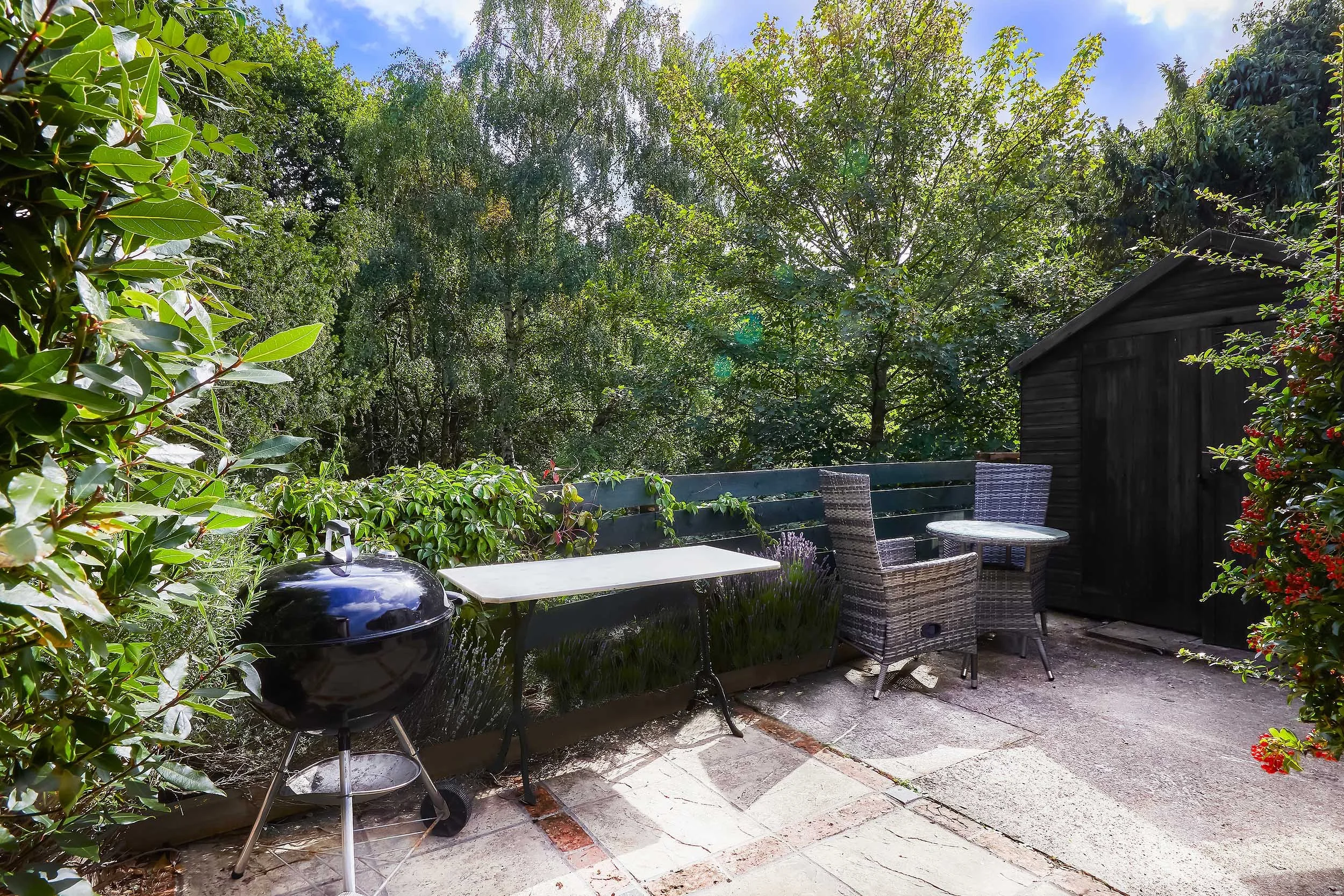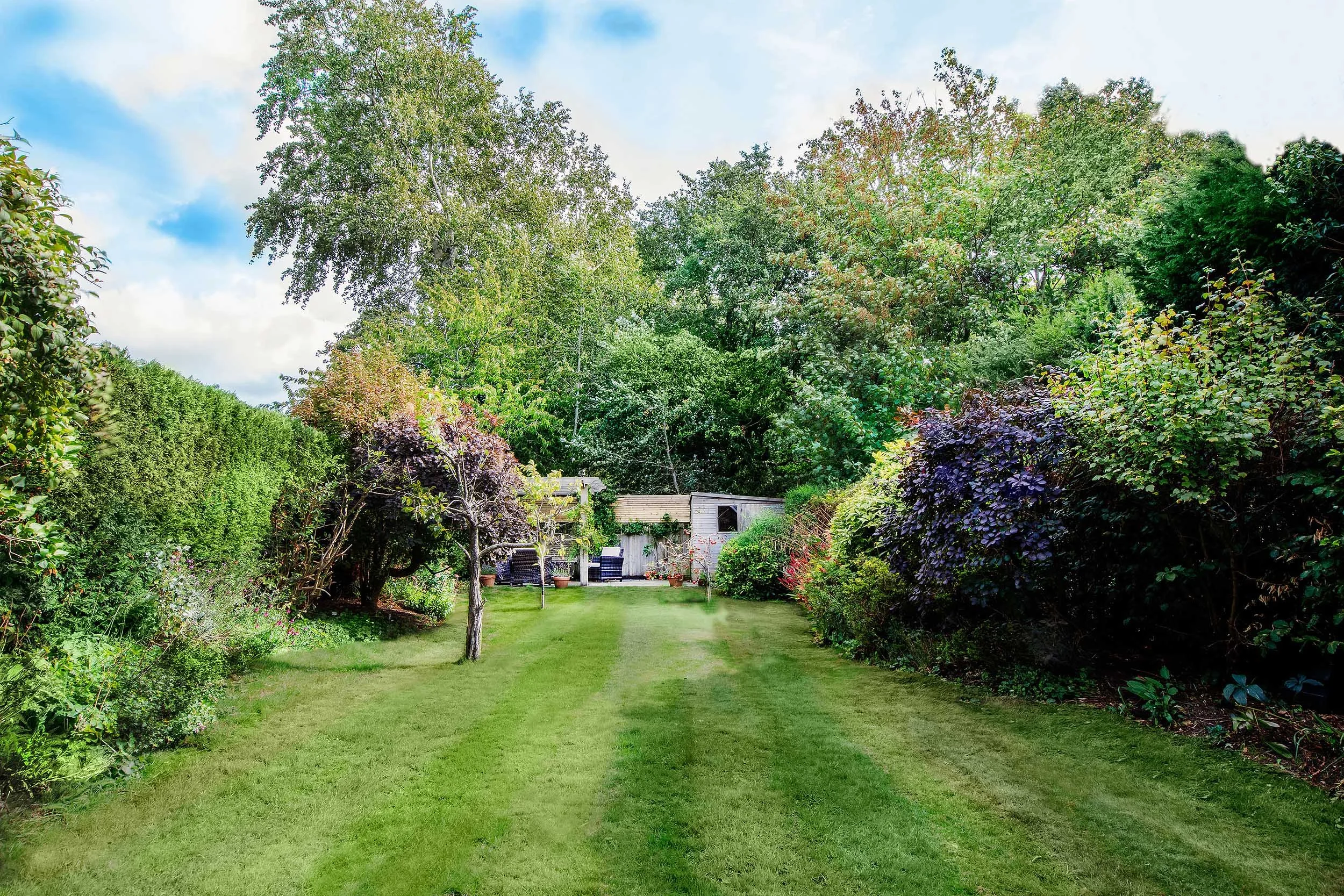 The property is approached over a tarmacadam driveway with parking for several vehicles and access to the detached double garage with electronically controlled garage door. The garage has an electric ‘Tesla’ charging port installed on the side. To the side of the driveway lies a front lawn bordered by well stocked shrub and plant beds. To the side of the garage is a useful timber garden shed. Side access to the rear garden is via gates on either side of the property, where a large decked area adjoins the rear of the property. A central lawn extends to the east bordered on either side with well stocked shrub and plant beds along with fruit trees. At the end of the garden is a paved terrace covered with a vine wrapped pergola. External storage is plentiful with four timber garden sheds.