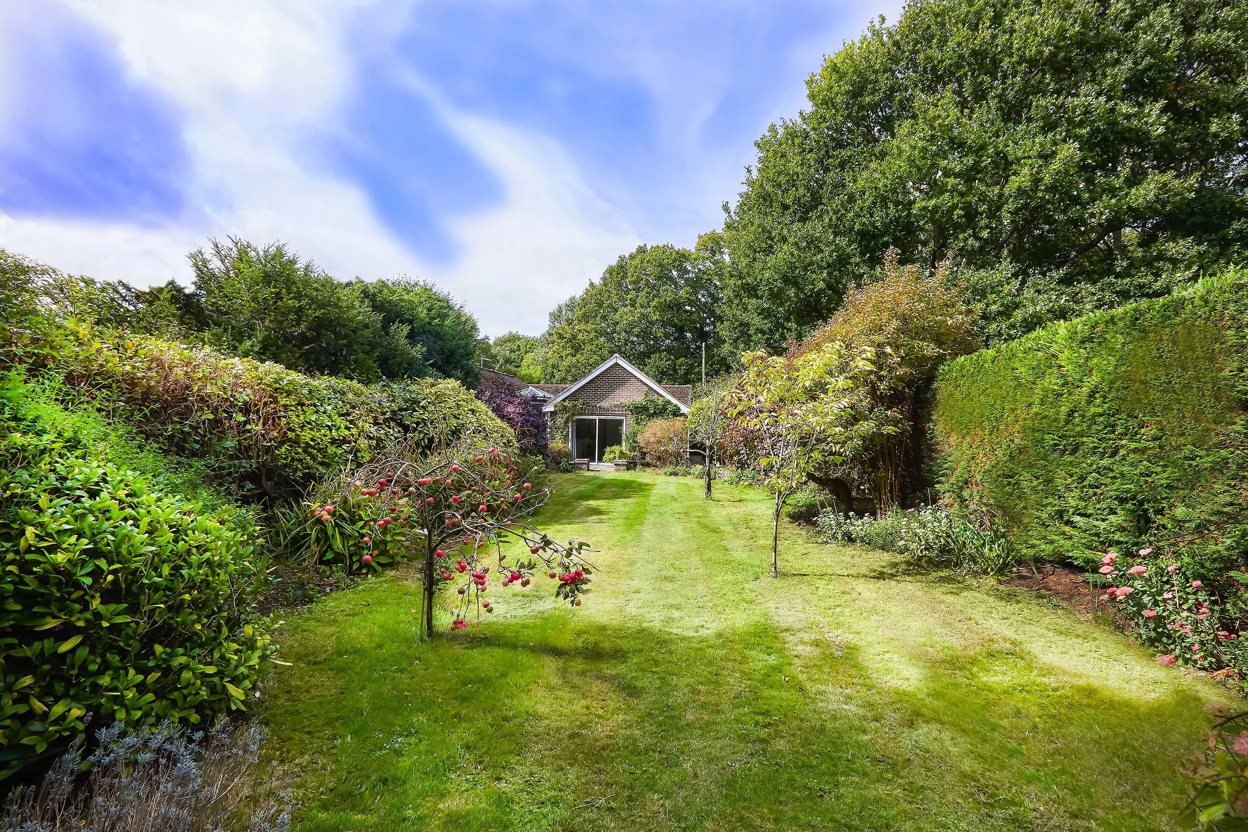 Rarely available and set in a superb location, along a private lane bordering the South Downs National Park, this impressive detached bungalow occupies a generous plot in a peaceful semi-rural setting and lies within easy reach of both the High Street and mainline train station. Having been thoughtfully extended over time with scope to further enlarge (stnc), the property offers versatile and well balanced accommodation, currently arranged with three reception areas including a spacious sitting room with a focal multi fuelled burner, a welcoming dining hall and a bright kitchen/breakfast room. The kitchen is fitted with a range of integrated appliances, bi-fold doors and complemented by a stylish modern maple wood breakfast bar, while a charming garden room at the front of the property provides an additional space to enjoy the surroundings. There are three well proportioned bedrooms served by a large family bathroom and a separate shower room complete with a fitted sauna. The beautifully private rear gardens extend to the east and are mainly laid to lawn, bordered by an array of mature shrubs, colourful planting and specimen fruit trees. A decked terrace adjoining the property and a further pergola covered seating area at the far end of the garden provide idyllic settings for outdoor entertaining or quiet relaxation. To the front, a driveway offers ample parking for several vehicles and access to a detached double garage with an electric door.
