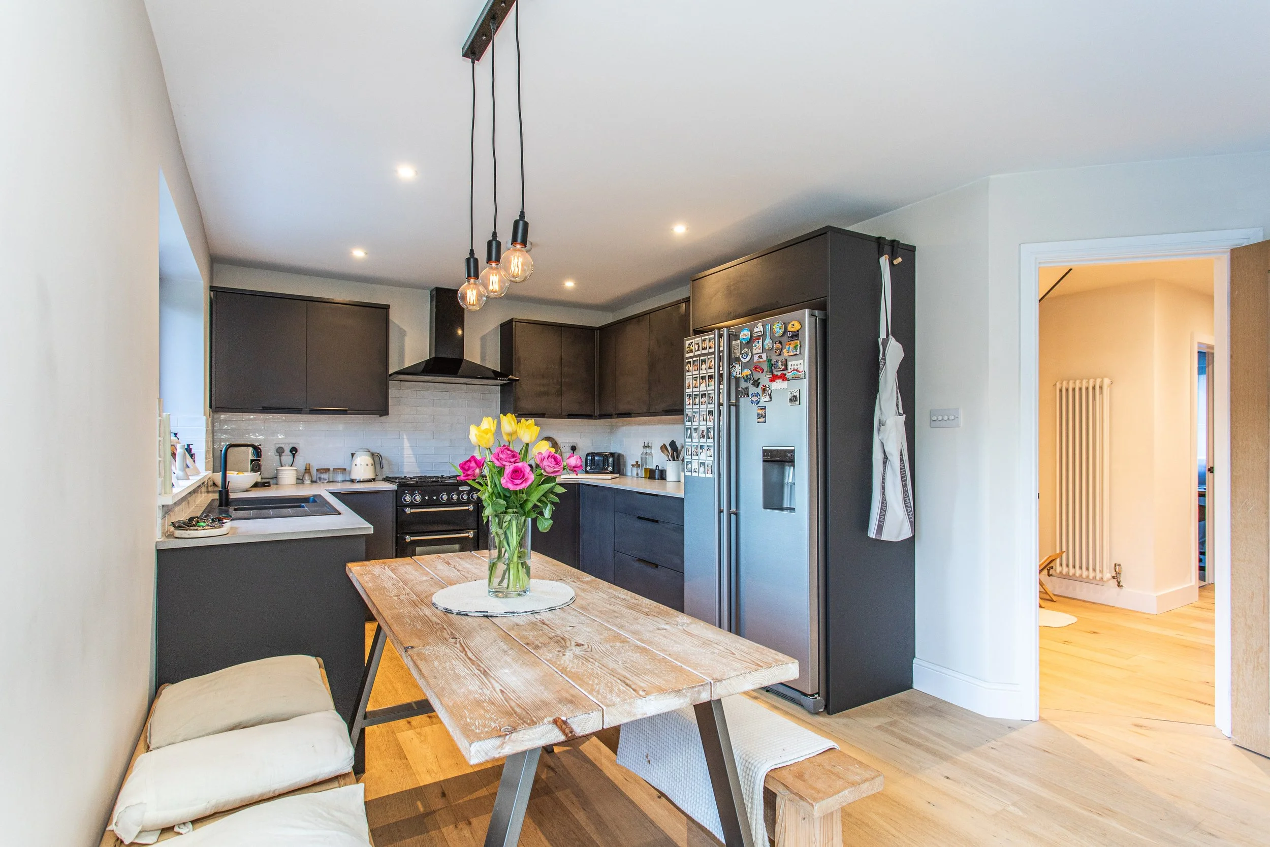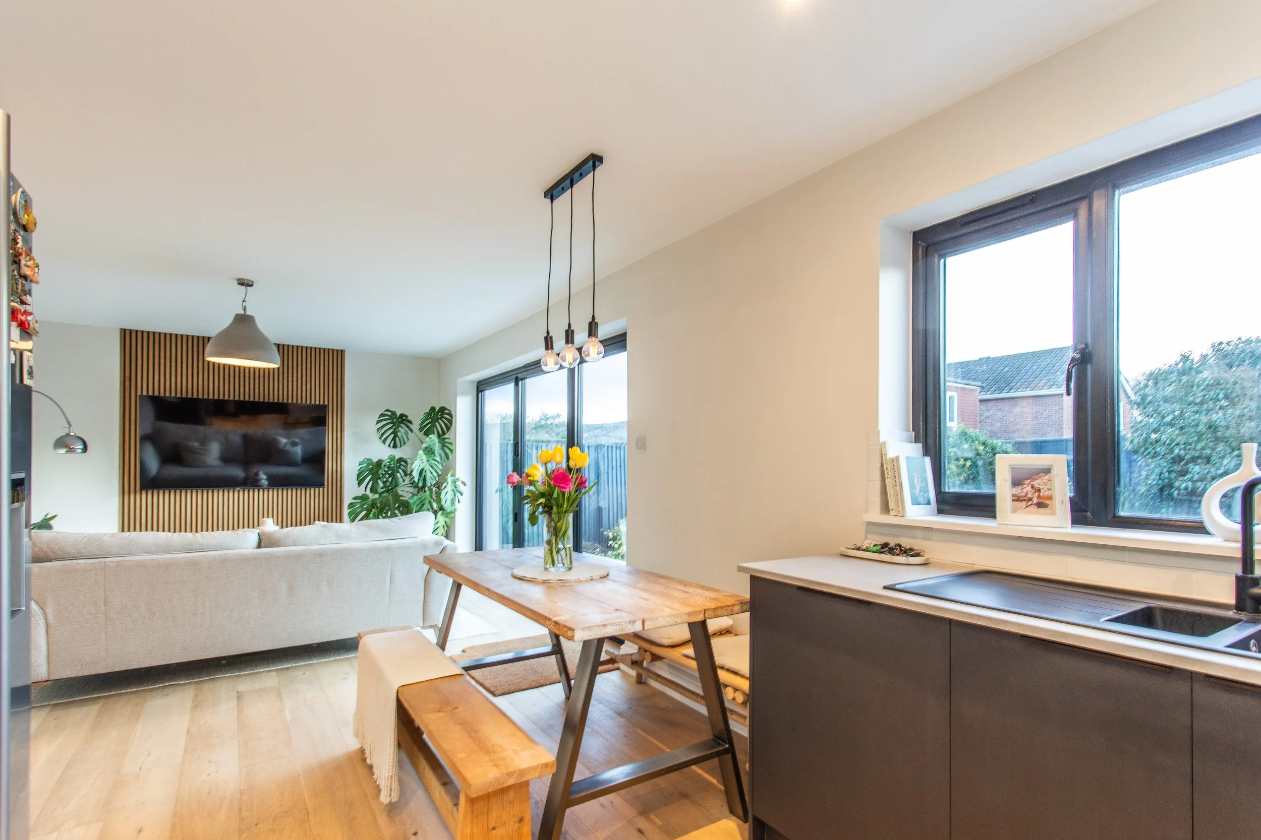 This stylishly presented home has been comprehensively extended, redesigned and updated by the current owners, including a thoughtfully executed loft extension that enhances both space and versatility. A generous entrance hallway sets the tone featuring engineered oak flooring that flows seamlessly into the light reception rooms. The ground floor offers two well proportioned reception rooms currently arranged as a sitting room and an office with the latter giving the flexibility to be used as a bedroom serviced by the modern ground floor shower room. The striking open-plan kitchen/dining/family room resides at the rear of the property with bi-fold doors opening directly onto the south facing rear garden. The contemporary fitted kitchen comprises a selection of modern wall and base units and provides space for a range of appliances. A useful utility room with space for a washing machine and additional storage completes the ground floor. To the first floor are three double bedrooms and a sleek family bathroom featuring a focal curved freestanding bath. The landscaped south facing rear garden is a particular highlight with a porcelain patio adjoining the bi-fold doors leading to a lawned garden and raised decked seating area interspersed with established planted borders. The driveway to the front of the property provides ample off street parking.